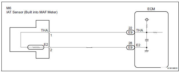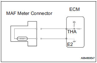 Resistor R and the IAT sensor are connected in series. When the resistance value of the IAT sensor changes, according to changes in the IAT, the voltage at terminal THA also varies. Based on this signal, the ECM increases the fuel injection volume when the engine is cold to improve driveability.