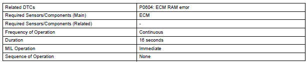 The ECM memory status is diagnosed by internal mirroring of the main CPU and the sub CPU to detect Random Access Memory (RAM) errors. The two CPUs also perform continuous mutual monitoring. The ECM illuminates the MIL and sets a DTC if: 1) outputs from the two CPUs are different or deviate from the standards, 2) the signals sent to the throttle actuator deviate from the standards, 3) a malfunction is found in the throttle actuator supply voltage, and 4) any other ECM malfunction is found.