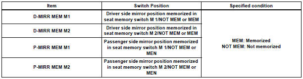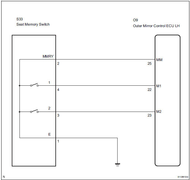 When the seat memory switch M1 or M2 is pressed, the position control ECU & switch (Seat ECU) transmits a signal of the memorized mirror position to the outer mirror control ECU. Then, the outer mirror control ECU drives the mirror motor.