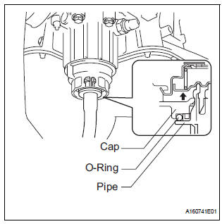 | NOTICE: Be sure to insert the pipe with the O-ring installed on the oil filter cap side. |
