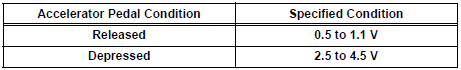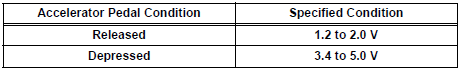 If the result is not as specified, check the accelerator pedal rod, wire harness or ECM.