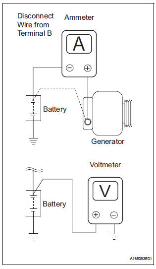 (1) Disconnect the wire from terminal B of the generator, then connect it to the negative (-) lead of an ammeter.