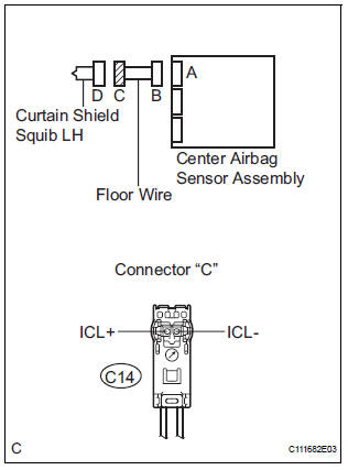 The curtain shield squib LH circuit consists of the center airbag sensor assembly and the curtain shield airbag assembly LH.