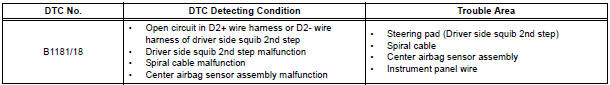 DTC B1181/18 is recorded when an open circuit is detected in the driver side squib 2nd step circuit.