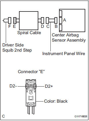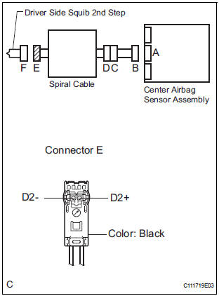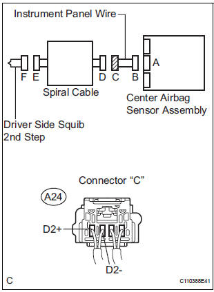 The driver side squib 2nd step circuit consists of the center airbag sensor assembly, the spiral cable and the steering pad.