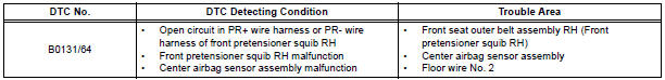DTC B0131/64 is recorded when an open circuit is detected in the front pretensioner squib RH circuit.