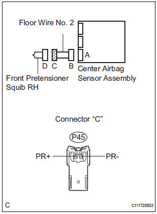 The front pretensioner squib RH circuit consists of the center airbag sensor assembly and the front seat outer belt assembly RH.