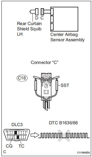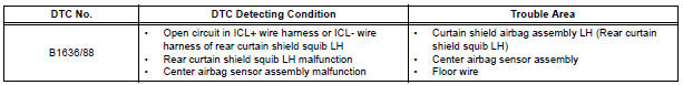 DTC B1636/88 is recorded when an open circuit is detected in the rear curtain shield squib LH circuit.