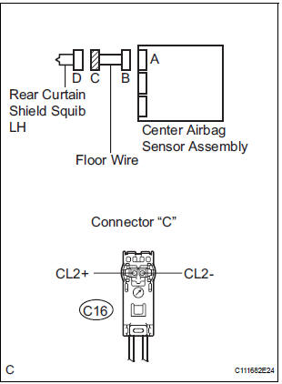 The rear curtain shield squib LH circuit consists of the center airbag sensor assembly and the curtain shield airbag assembly LH.
