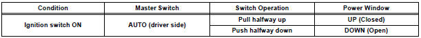 Press LOCK switch pressed for 1.5 sec. or more | All power windows go UP |
