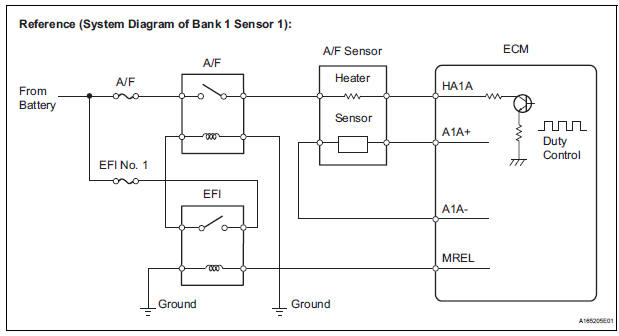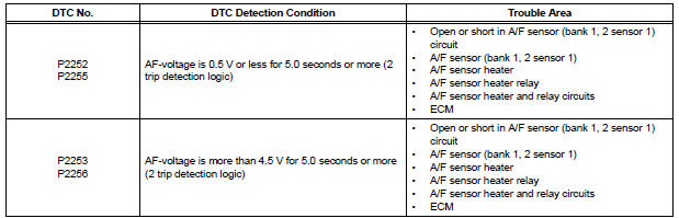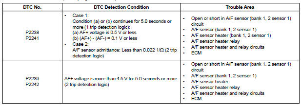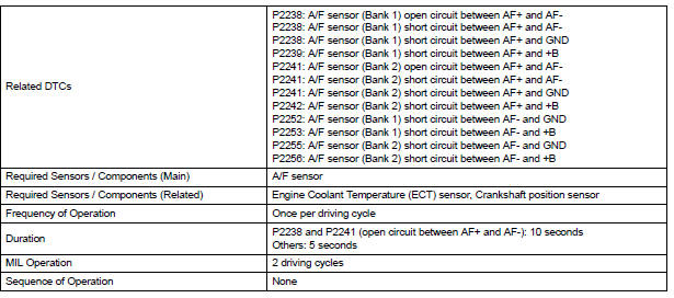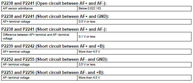 The Air-Fuel Ratio (A/F) sensor varies its output voltage in proportion to the air-fuel ratio. If the A/F sensor impedance (alternating current resistance) or voltage output deviates greatly from the standard range, the ECM determines that there is an open or short malfunction in the A/F sensor circuit.