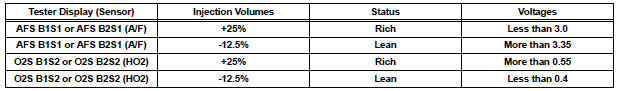 For use of the intelligent tester only: Malfunctioning areas can be identified by performing the A/F CONTROL function provided in the ACTIVE TEST. The A/F CONTROL function can help to determine whether the Air-Fuel Ratio (A/F) sensor, Heated Oxygen (HO2) sensor and other potential trouble areas are malfunctioning.