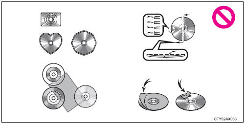 | NOTICE Discs and adapters that cannot be used Do not use the following types of CDs. Also, do not use 3 in. (8 cm) CD adapters, DualDiscs or printable discs. Doing so may damage the CD player and/or the CD insert/eject function.