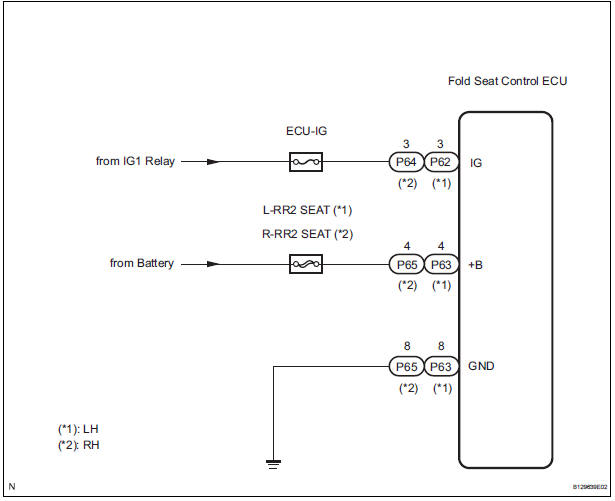 Power is supplied to the fold seat control ECU through the L-RR2 SEAT and R-RR2 SEAT fuses.