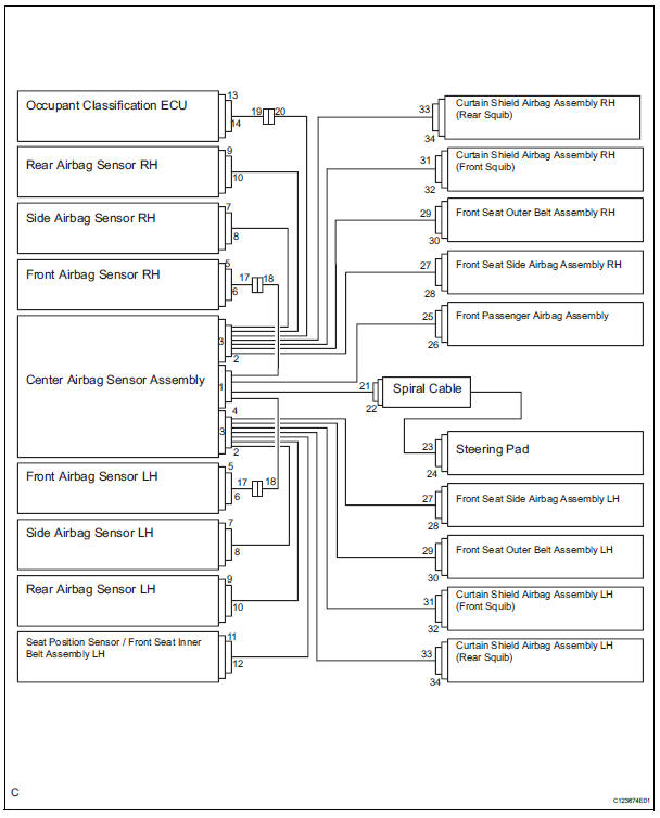 HINT: In the airbag system, the center airbag sensor assembly, front airbag sensors LH and RH, side airbag sensors LH and RH, rear airbag sensors LH and RH are collectively referred to as the airbag sensors.