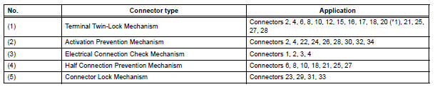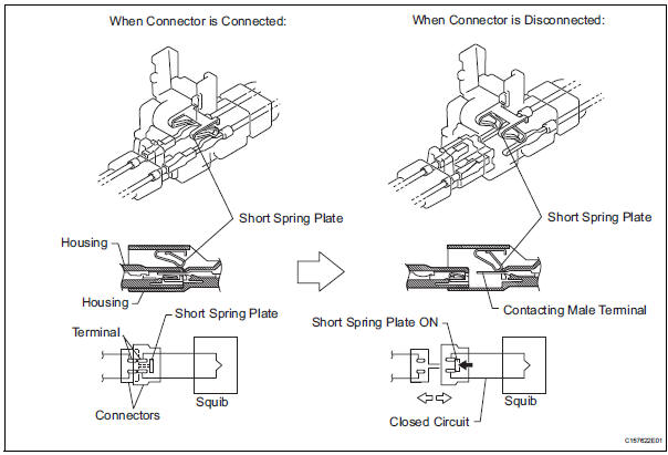 (2) Activation prevention mechanism: All connectors with an activation prevention mechanism contain a short spring plate. When these connectors are disconnected, the short spring plate creates a short circuit by automatically connecting the positive (+) and negative (-) terminals of the squib.