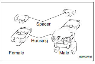 (1) Terminal twin-lock mechanism: All connectors with a terminal twin-lock mechanism have a two-piece component consisting of a housing and a spacer. This design enables the terminal to be locked securely by two locking devices (the retainer and the lance) to prevent terminals from coming out.
