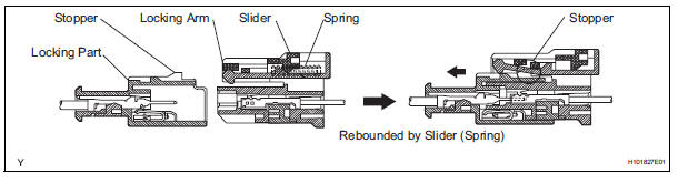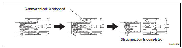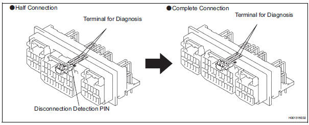 (3) Electrical connection check mechanism: This mechanism electrically checks that the connectors are connected correctly and completely. The electrical connection check mechanism is designed so that the disconnection detection pin connects with the diagnosis terminals when the connector housing lock is locked.