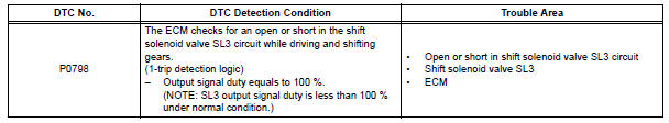 The ECM commands gear shifts by turning the shift solenoid valves "ON/OFF". When there is an open or short circuit in any shift solenoid valve circuit, the ECM detects the problem and illuminates the MIL and stores the DTC. And the ECM performs the fail-safe function and turns the other normal shift solenoid valves "ON/OFF" (In case of an open or short circuit, the ECM stops sending current to the circuit.) (See page AX-30).