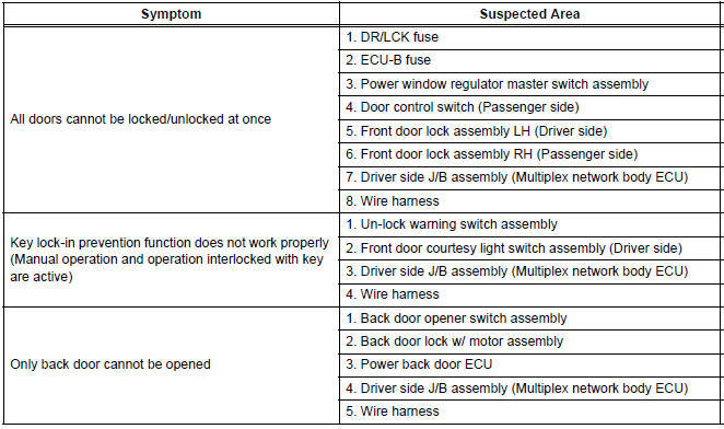 HINT: Inspect the fuse and relay before investigating the suspected areas shown in the table below.