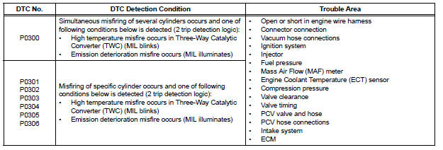 The ECM illuminates the MIL and sets a DTC when either one of the following conditions, which could cause emission deterioration, is detected (2 trip detection logic).