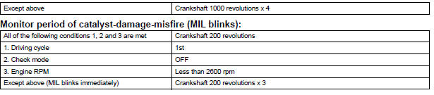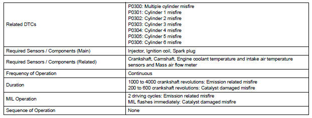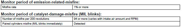 The ECM flashes the MIL and sets a DTC when either one of the following conditions, which could cause the Three-Way Catalytic Converter (TWC) damage, is detected (2 trip detection logic).