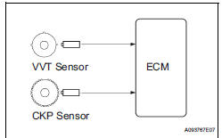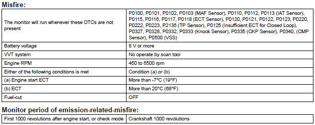 When the engine misfires, high concentrations of hydrocarbons (HC) enter the exhaust gas. High HC concentration levels can cause increase in exhaust emission levels. Extremely high concentrations of HC can also cause increases in the Three-Way Catalytic Converter (TWC) temperature, which may cause damage to the TWC. To prevent this increase in emissions and to limit the possibility of thermal damage, the ECM monitors the misfire rate. When the temperature of the TWC reaches the point of thermal degradation, the ECM blinks the MIL. To monitor misfires, the ECM uses both the VVT sensor and the Crankshaft Position (CKP) sensor. The VVT sensor is used to identify any misfiring cylinders and the CKP sensor is used to measure variations in the crankshaft rotation speed. Misfires are counted when the crankshaft rotation speed variations exceed predetermined thresholds. If the misfire count exceeds the threshold levels, the ECM illuminates the MIL and sets a DTC.