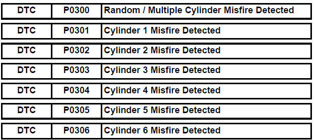 When multiple DTCs for misfiring cylinders are set, but DTC P0300 is not set, it indicates that misfires have been detected in different cylinders at different times. DTC P0300 is only set when several misfiring cylinders are detected at the same time.