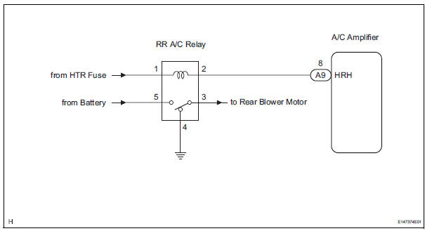 The RR A/C relay is switched on by signals from the A/C amplifier. It supplies power to the rear blower motor.