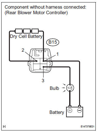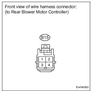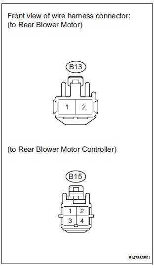 (c) Connect the positive (+) lead to terminal 1 of the rear blower motor connector, and the negative (-) lead to terminal 2.