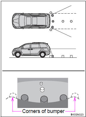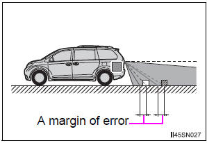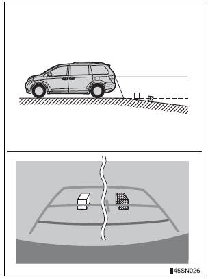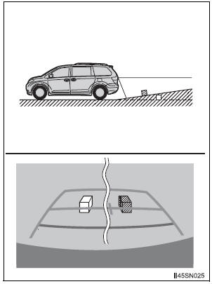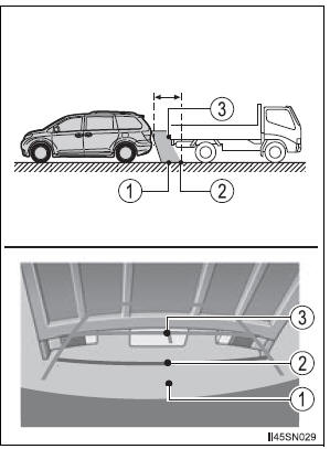 The distance guide lines are displayed according to flat surfaced objects (such as the road). It is not possible to determine the position of three-dimensional objects (such as vehicles) using the distance guide lines. When approaching a three-dimensional object that extends outward (such as the flatbed of a truck), be careful of the following.