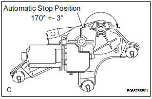 With the motor being rotated disconnect the terminal 3 (LS) from the battery (-), then check that the wiper motor stops automatically to the automatic stop position