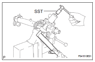 (i) Using SST, hold the rack guide spring cap and using another SST, torque the rack guide spring cap nut.
