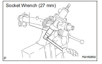 (p) Using a socket wrench (27 mm), install the rack housing cap.