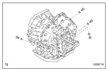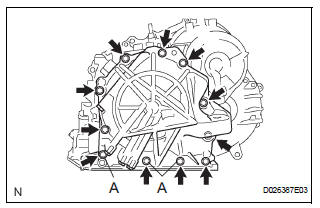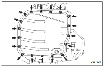 (c) Install the oil pan and new oil pan gasket to the transaxle case with the 18 bolts.