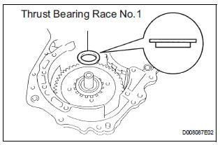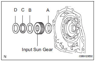 (b) Install the 2 thrust bearings, the bearing race and the input sun gear to the front planetary gear assembly.