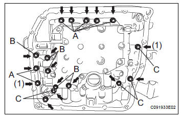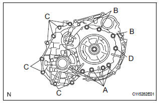 Torque: 11 N*m (110 kgf*cm, 8 ft.*lbf) Bolt length: Bolt A: 41 mm (1.614 in.) Bolt B: 57 mm (2.244 in.) Bolt C: 25 mm (0.984 in.)