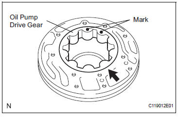 (a) Coat the front oil pump drive gear with ATF, and install it to the oil pump body with the marked side facing upward.