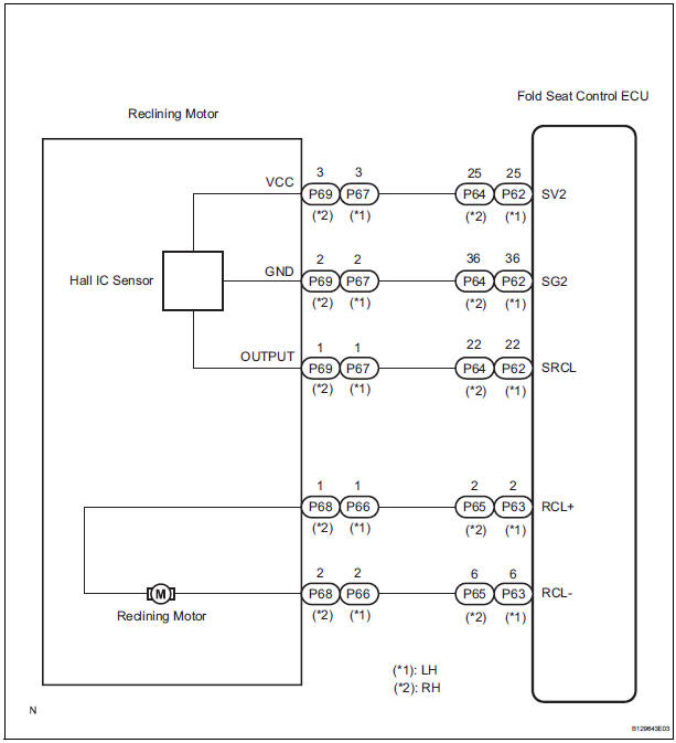 The fold seat control ECU receives a switch operation signal from the power rear no. 2 seat switch and the fold seat switch, and activates the reclining motor. At this time, the Hall IC (seatback position sensor) detects the actuation of the seatback and sends a seatback actuation signal to the fold seat control ECU.