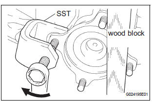 (a) Using SST and wood block, remove the rear differential side gear shaft bolt.