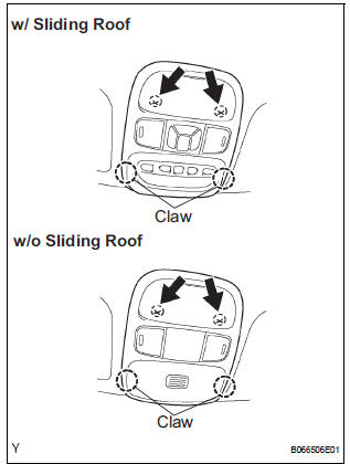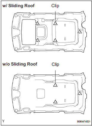 NOTICE: In order to prevent the roof headlining from becoming bent, work must be performed by 2 or more persons when removing/installing it