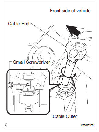 (f) Using a screwdriver, disconnect the cable end from the shift lever assembly (g) Using a small screwdriver, disconnect the cable outer of transmission control cable assembly from the shift lever assembly.