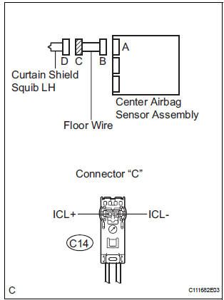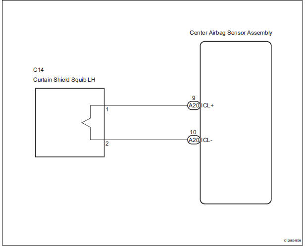 The curtain shield squib LH circuit consists of the center airbag sensor assembly and the curtain shield airbag assembly LH.