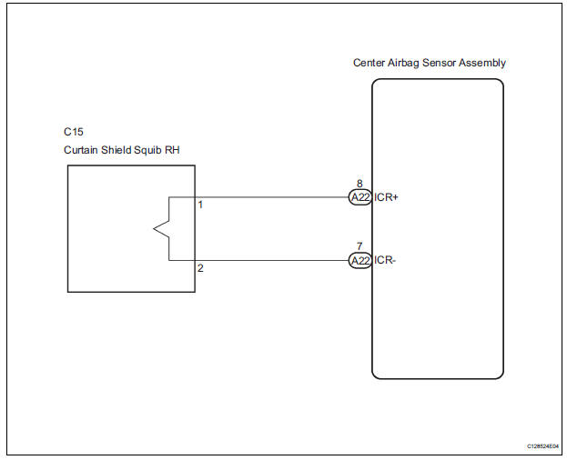 The curtain shield squib RH circuit consists of the center airbag sensor assembly and the curtain shield airbag assembly RH.