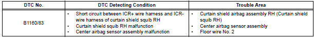 DTC B1160/83 is recorded when a short circuit is detected in the curtain shield squib RH circuit.