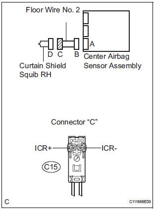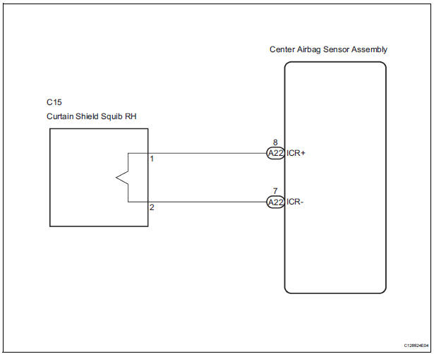 The curtain shield squib RH circuit consists of the center airbag sensor assembly and the curtain shield airbag assembly RH.