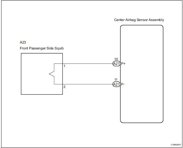 The front passenger side squib circuit consists of the center airbag sensor assembly and the front passenger airbag assembly.