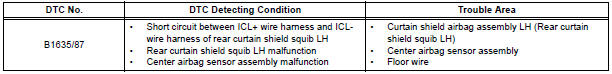 DTC B1635/87 is recorded when a short circuit is detected in the rear curtain shield squib LH circuit.