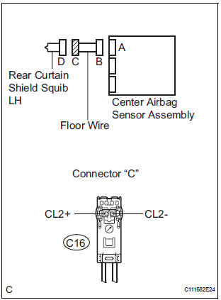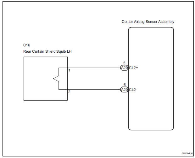 The rear curtain shield squib LH circuit consists of the center airbag sensor assembly and the curtain shield airbag assembly LH.