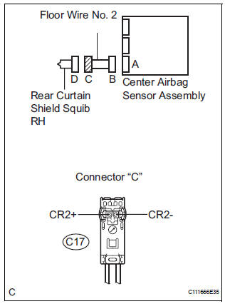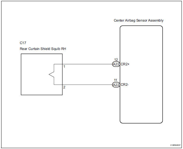 The rear curtain shield squib RH circuit consists of the center airbag sensor assembly and the curtain shield airbag assembly RH.